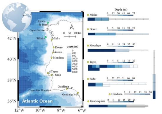 As typical grid resolutions of regional ocean models are greater than 1 km, a proper representation of all major rivers and estuaries in the western Iberian Peninsula would prove to be very complicated. Another issue is the collection of local bathymetric data for initial setup as well as their update over the years due to sediment dynamics. This study aimed to overcome this barrier by improving land–ocean interactions through the input of river flows into schematic rivers and estuaries.