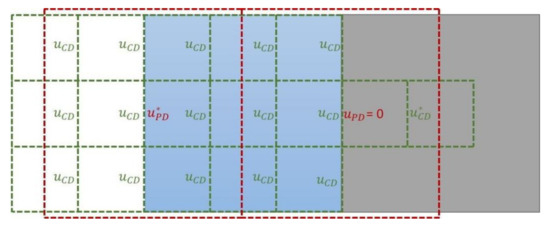 which is a simple summation of all local domain fluxes (ex: multiplied by the vertical area of its correspondent cell face—in the right-most green dashed line square of (Figure 2) crossing the cell faces of the regional domain cell identified by the user; in this case, it is imposed in the blue filled PD cell of Figure 2. F is computed for every vertical layer of the PD, creating one discharge point per vertical layer. In this equation, represents the normal velocity of the cross section (in Figure 2 the dashed green line, where is computed. stands for the vertical area of the CD cell associated with , where k is the vertical layer and h is the depth of the cell at the face. As these fluxes are obtained by output files of the CD, a linear temporal interpolation is performed using the nearest two time instants of the output file, to be imposed in the current time instant of the PD.
