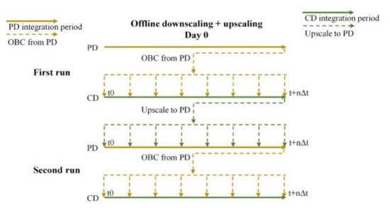 In both cases, the information is transferred on a daily basis, where each model simulates one day at a time and then transfers the information. This procedure can be repeated any number of times, increasing the grid communication of the coupling. However, in this work, only one repetition is performed, which means upscaling is only performed one time.