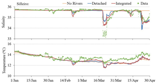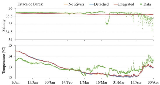 Temperature and salinity obtained by the three PCOMS implementations (without rivers, detached, and integrated offline upscaling) were compared against the Silleiro and Estaca de Bares moored stations during the period between 1 January and 1 May 2018 (Figure 4 and Figure 5).