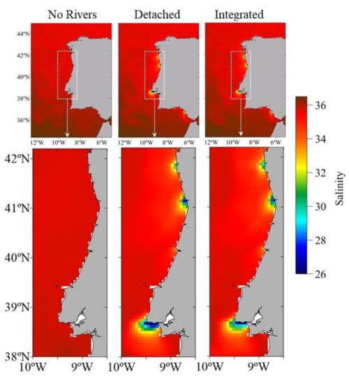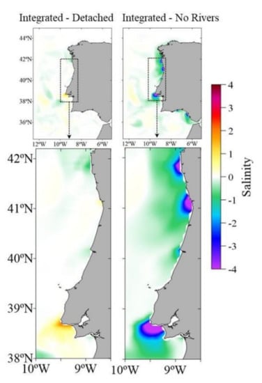 Very small differences were observed between results obtained by the two offline upscaling methodologies (detached and integrated—Figure 7). The first is in the vicinity of the Tagus estuary, where the new methodology produced higher salinity values (1 to 1.5) instead of the expected lower values (due to the higher level of grid communication). The explanation for this difference is more complex and is related to the schematic domains volume available, combined with the difference in the methodology. Because in the detached methodology the rivers and estuaries open boundary conditions were always fed by the no-rivers PCOMS version, their open boundary values of salinity are constantly high (above 35). When combined with the lower volume of the channel in comparison with the current operational version of the Tagus estuary model domain (described and validated in de Pablo et al. [80]), lower salinity values will be produced near the estuary mouth (from where the fluxes are retrieved and added to PCOMS). As such, there will be less vertical mixing between ocean and river water, which leads to a higher surface gradient of salinity when high river flow rates are present. In the northern rivers, this effect does not take place, most likely due to a better volume correlation between the schematic rivers and estuaries and reality and due to their higher flow rate in comparison with their tidal prism. Therefore, in the northwest coast of the IP, the integrated methodology produced slightly lower values (around 0.5) of surface salinity—as expected when the schematic rivers and estuaries receive updated boundary conditions from PCOMS. In the adjacent area of the Guadiana and Guadalquivir mouths (Figure 6 and Figure 7), the impact of the two offline upscaling methodologies is quite similar, which can be caused by the local hydrodynamics—through higher mixing in the area—which can increase diffusion and therefore reduce the differences between methodologies. A zoom of the area of interest, which covers a part of the west coast of the IP, is shown in both Figure 6 and Figure 7 for a better visualization of this analysis in the ROFI areas.
