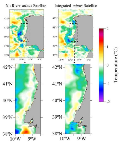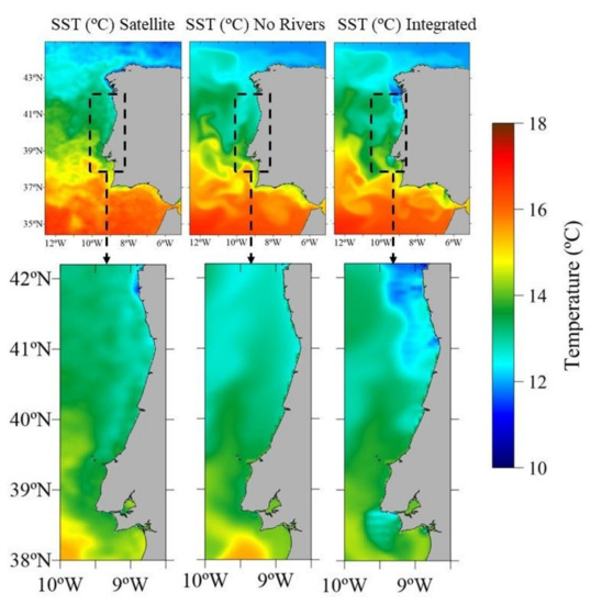 An analysis of surface temperature map was done near the peak period (20 March) against satellite data with an aim not only to obtain validation of the schematic rivers and estuaries methodology and the integrated offline upscaling but also to obtain a broader view of the surface temperature patterns over the coastal area of the western coast of the IP when river inputs are considered. The comparison (Figure 8) was made only for the no-rivers and the integrated methodologies for the period of peak flow (18 March–1 April) due to the high similarity between the latter and the detached methodology. At first glance, the results (Figure 8) show the typical Northern Hemisphere north–south temperature gradient, with increasing temperatures towards the equator in both methodologies. However, major differences were obtained in the coastal area of the IP and near its ROFI areas (Figure 9), where the influence of the freshwater inputs (present only in the PCOMS version where the integrated offline upscaling methodology was applied). River inputs played a key role in surface temperature near the coast and up to 80 km offshore in the latitude of the Douro and Minho Rivers mouths, which have the highest flow rates (Table 3). A zoom of the coastal area of the IP is provided in both Figure 8 and Figure 9 for an easier analysis of these results.