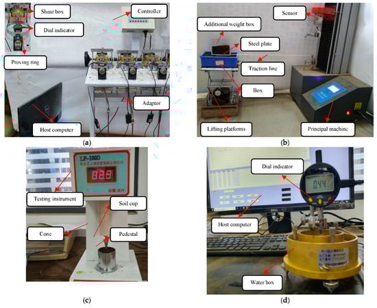 Soil cohesiveness referred to the property of bonding behavior between soil particles through molecular gravity. Therefore, soil could resist damage and dispersion. The strength of soil cohesiveness was expressed by cohesion []. The four soil samples were placed in four shear boxes (Figure 2a), and different normal loads, σ (100, 200, 300, 400 kPa), were applied to the soil samples of the same experimental level. The temperature in the laboratory was 20 °C. The four proving rings were installed sequentially from left to right, and their calibration coefficients, C, were 1.784, 1.802, 1.887, and 1.919 kPa/0.01 mm, respectively. Due to the contact between the proving ring and the dial indicator, the sample was sheared, causing the proving ring to be squeezed, which led to the change of the reading of the dial indicator. The dial indicator (the measuring range of 10 mm, and the division value of 0.01 mm) and the data adapter were connected to the host computer to record data in real time. Through the controller, the shear speed and shear displacement were set to 0.8 mm·min−1 and 6 mm, respectively. If the reading of the dial indicator showed a peak value with the increase of shear displacement, the peak point value was selected as the value of the dial indicator, R0. If the peak value did not appear with the increase of shear displacement, the reading at a shear displacement of 6 mm was selected as the value of the dial indicator, R0. The soil cohesion force, c, and the angle of internal friction, ϕ, were calculated as follows:
