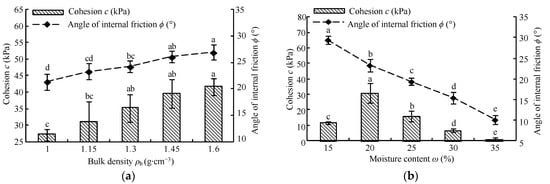 High cohesiveness had negative effects on soil breakage during tillage and restricted the tillage quality of soil. Figure 3 shows the variation trend of the cohesion of paddy soils under different bulk density and moisture content. It could be seen from Figure 3a that as the bulk density varied from 1 to 1.6 g·cm−3, the cohesion and angle of internal friction of paddy soil tended to increase. When the bulk density of paddy soil reached 1.45 g·cm−3 or above, the cohesion was significantly different compared with that under the bulk density of 1 and 1.15 g·cm−3 (p < 0.05). The angles of internal friction for the bulk density of 1, 1.3, and 1.6 g·cm−3 were significantly different from each other (p < 0.05), with an increasing ratio of about 12.5%.