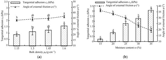 As the moisture content of paddy soil increased from 15% to 35% (Figure 4b), the tangential adhesion increased, and the angle of external friction decreased. The angle of external friction and tangential adhesion corresponding to different moisture contents showed significant differences (p < 0.05). With the increase of moisture content, the increasing degree of tangential adhesion decreased gradually, while the decreasing degree of the angle of external friction increased gradually. In conclusion, compared with bulk density (1 to 1.6 g·cm−3), the change of moisture content in the range of 15% to 35% had a greater impact on the tangential adhesion and the angle of external friction. The reduction of bulk density and moisture content can reduce the tangential adhesion to a lower level.