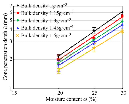The greater plasticity index represented the stronger plasticity of soil. As a result, it was more difficult to break up soil in the process of cultivation. Figure 5 shows the relation curve between the cone penetration depth, h, and moisture content, ω, in the double logarithmic coordinate system under different bulk density. Under the same bulk density, the cone penetration depth increased with the increase of moisture content. The cone penetration depth of the same moisture content decreased with the increase of bulk density. Among them, bulk densities of 1 and 1.3 g·cm−3, 1.15 and 1.45 g·cm−3, and 1.3 and 1.6 g·cm−3 showed significant differences in cone penetration depth (p < 0.05, as shown in Figure 5).