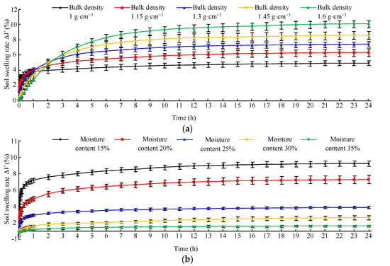 Relation curves of swelling rate of paddy soil with time: (a) variation of paddy soil in bulk density, and (b) variation of paddy soil in moisture content.