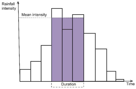 Block rains (see an example in Figure 1) describe mean rainfall intensities over fixed duration periods (5 min, 10 min …). These block rains are generated from time series of rain intensity measurements []. Successive time windows of selected durations (5 min, 10 min …) pass through the series of data and the level of rain intensity is stored as block rains for the respective duration. The block rains are then ranked in size, and the frequency of the extremes then form a basis for treatment by EVA methods.