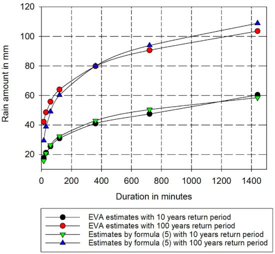 Through the application of Equation (7), it turned out that the non-linear estimates resulted in underestimates as compared with the EVA data. A simple correction Δ of the estimates was introduced. mm, where D is the duration of the block rains. The Final Estimate = Estimate (by Equation (7)) + .