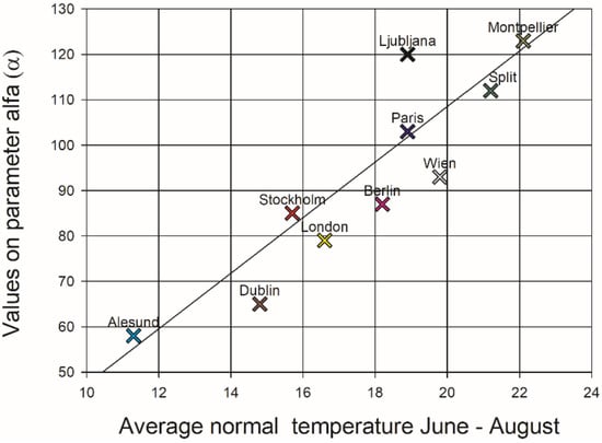 Examples of the variation of the factor alfa (α) in relationship (5). There is an indication of higher values of α with increasing average (June–August) normal (1961–90) temperatures.