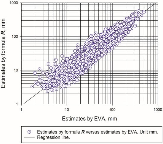 The developed equation R is based on a non-linear estimation with data from 4132 rain intensity values, or “block rains”, in dataset R1. Dataset R2, for broader applications, covers locations with an average monthly normal temperature during the two wettest months extending from +9.7 °C to +29.0 °C. These data also cover a normal yearly precipitation sum extending from 302 mm to 2064 mm. The duration of the rainfall statistics (based on block rains) covers the time span of 5 min to 24 h. The variance of EVA data in the dataset R1 is explained by this relationship up to 90% (with the mean corrected explained variance at 79%) and in the independent dataset R2, it explains up to 90% (with the mean corrected explained variance at 80%).