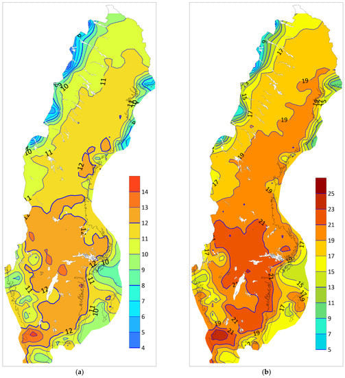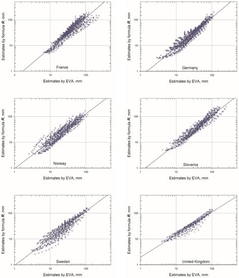 In Sweden, the regional statistics were developed in 1979 [] by use of a factor that consisted of the difference between the average summer temperature and the mean temperature during a month in spring. This factor was created to emphasize convective rainfall and reduce the influence of low-intensity rainfall caused by oreigenic rainfall [,]. When convection also started to be more intense in spring, this approach had to be abandoned and a new method was introduced []. This method was based on some cloud physics and calibrated with EVA data and is recommended in today’s guidelines [] in Sweden. The cloud physics approach was further developed and applied to climatological data for Europe [].