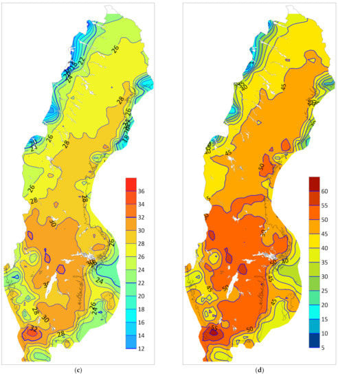 (a,b) IDF maps of Sweden based on the formula R. Map 8a illustrates the rainfall pattern with 10 min of duration and 10 years of recurrence. Map 8b illustrates 10 min of duration with 100 years of recurrence. Unit: mm. (c,d) IDF maps of Sweden based on the formula R. Map 8c illustrates the rainfall pattern with 60 min of duration and 10 years of recurrence. Map 8d illustrates 60 min of duration with 100 years of recurrence. Unit: mm.