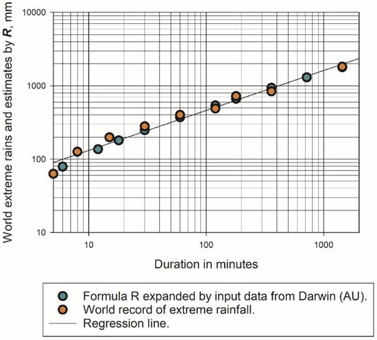 World rainfall records vs. formula R applied on climatological data from Darwin, Australia: Data from Darwin was used with the relation R and with regression of the parameter ‘return period’. The return period obtained is 342 years (Wald confidence 95%, 321–363 years) with 99.6% explained variance.