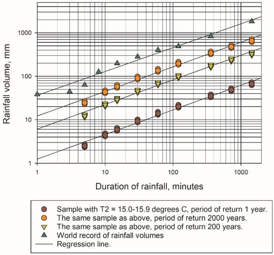 The world records of intense rainfall [] give a probable upper threshold of what levels of rainfall and PMP can be reached. Figure 9 illustrates the absolute world maximum rainfall of today together with one example of estimates that the formula R gives by regression of the parameter ‘return period’.