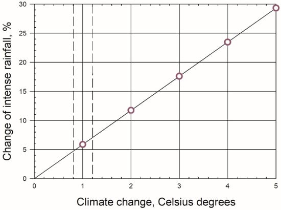 According to Clausius-Clapeyron’s (‘CC’) relation, the moisture holding capacity is about 7% per °C rise. Intensified rainfall at this level would be expected. The result shown in Figure 11 indicates an average increase of 5.87% per degree. The spread around this value is considerable, as seen in Table 6. The result supports the statement of the IPCC []: “Extreme precipitation events over most of the mid-latitude land masses and over wet tropical regions will very likely become more intense and more frequent”. More information on the result of the use of formula R and fictive temperature increases is contained in Table 6.