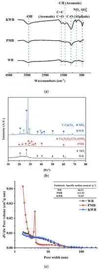 The microstructure of biochar: (a) FTIR analysis of biochar samples; (b) XRD analysis of biochar samples; (c) variation of pore volume with pore width obtained using BET analysis of biochar samples.