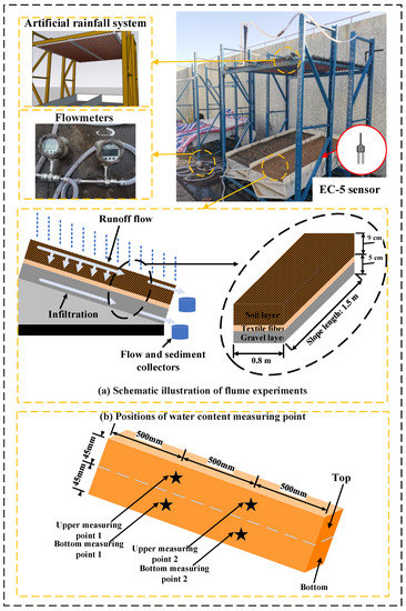 Figure 2 indicates the schematic diagram of rainfall simulator setup for flume tests. The major components of the rainfall simulator include a water supply system with spray nozzle, supporting metal frames, flow meters, collectors, and water content sensors. The rainfall simulator used in the current test was a 448-nozzle unit in design and principle of work. The water supply system was 1.5 m in length, 0.8 m in width, and 2 m above the flume. Two control valves were used to control the flow rate. The flow meters were connected to the pipe for monitoring the flow. Adopting the design of Morbidelli et al. [71], the runoff and infiltration during the rainfall event were collected separately by plastic buckets. The moisture content over time was recorded by four water content sensors (EC-5) for each group. The locations of the four sensors are shown in Figure 2b.