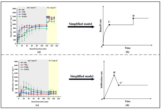 As shown in Figure 3, a simplified model for the variation of runoff and infiltration rate with time is proposed. It is generally believed that the runoff and infiltration rate increase with the increase in time at the beginning of rainfall. After a certain time, the runoff and infiltration rate reach a constant value (peak). This constant value is related to rainfall intensity. According to the results shown in Figure 3a,c, the characteristic curves of runoff and infiltration rate over time under the rainfall conditions are proposed.
