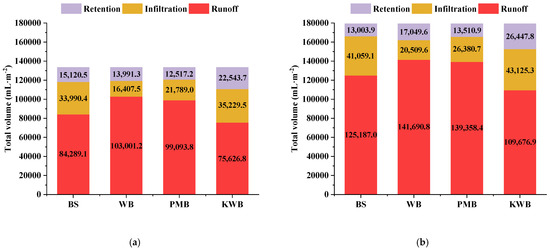 Equation (3) is used to calculate the total volume of runoff and infiltration in the whole rainfall event. The total volumes of runoff and infiltration during the rainfall event are shown in Figure 4. Figure 4a shows the total flow volume distribution after 120 min of rainfall, that is, under the condition of low rainfall intensity. The order of the total runoff volume of each sample is WB > PMB > BS > KWB. The total runoff volumes of WB, PMB, BS, and KWB account for 77.2%, 74.3%, 63.2%, and 56.7% of total rainfall volume, respectively. KWB sample has the lowest total runoff volume, which is 75,626.8 mL·m−2. Compared with BS (84,289.1 mL·m−2), KWB reduces the total runoff by 10.3%. WB and PMB increase the total runoff of the samples, which are 103,001.2 mL·m−2 and 99,093.8 mL·m−2, respectively. On the contrary, the order of the total infiltration volume of each sample is WB < PMB < BS < KWB. The total infiltration volumes of WB, PMB, BS, and KWB account for 12.3%, 16.3%, 25.5%, and 26.4% of the total rainfall volume, respectively. The total volume of infiltration in the KWB sample is the highest, which is 35,229.5 mL·m−2. The total infiltration volume of BS (33,990.4 mL·m−2) is almost the same as that of KWB. Compared with BS, WB and PMB reduce the total volume of infiltration in samples, which are 16,407.5 mL·m−2 and 21,789.0 mL·m−2, respectively.