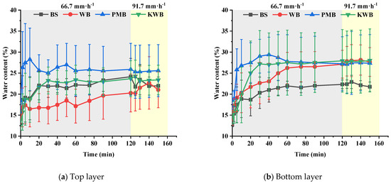 Since each rainfall event lasts only 150 min, evapotranspiration can be ignored. Then, the water retention volume of samples can be calculated using Equation (7). Total flow volume distribution (runoff, infiltration, and water retention) of rainfall events at different times are summarized in Table 4. As shown in Figure 4 and Table 4, the water retention volumes of all samples are related to the runoff and infiltration. In general, high infiltration leads to a higher water retention volume. The total volume of biochar–soil amendment retained water accumulates gradually with an increase in rainfall duration. This change is also picked up by installed soil moisture sensors (see Figure 5). Figure 5 shows that the soil moisture content of most samples increases gradually with rainfall duration and then remains stable after reaching the peak. The water content increment of KWB is the largest in rainfall (from 13.4% to 25.7%). Correspondingly, its total water retention volume is also the largest (see Table 4 and Figure 4). In summary, biochar, runoff, and infiltration all affect the water retention in the soil during rainfall. The water retention of the incubated soil is reduced by the decreased infiltration rate due to surface solidification. In addition, soil internal water content and water retention are also different due to the heterogeneity of the soil medium. As shown in Figure 5, the water content captured by the upper soil moisture sensor and the bottom soil moisture sensor is often different.