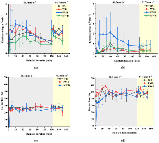 Figure 6 shows the variation of erosion rate and biochar loss rate. The event consists of 120 min of low rainfall and 30 min of heavy rainfall. At 120 min, the simulated rainfall intensity suddenly increases from 66.7 mm·h−1 to 91.7mm·h−1. Figure 6a represents the relationship between erosion rate in runoff and rainfall duration. At first, the erosion rates of all the samples increase with rainfall duration until they reach the peak. After about 50–60 min, the erosion rates gradually decrease until they stabilize. It takes around 90 min for the erosion rate to reach stability. KWB has the lowest peak erosion rate (about 1.75 g·m−2·min−1). Conversely, PMB has the highest peak erosion rate (about 2.83 g·m−2·min−1). Compared with BS, KWB effectively decreases the peak erosion rate by about 20.0%. However, PMB increases the peak erosion rate by about 30.4%. The erosion rates of all samples increase after the sudden increase of rainfall intensity. In particular, the stable erosion rate of KMB is 1.50 g·m−2·min−1, which is the lowest of all the samples. Furthermore, the biochar loss rates of WB, PMB, and KWB account for 27.4%, 25.6%, and 24.0% of the total runoff erosion, respectively. Figure 6b represents the relationship between erosion rate in infiltration and rainfall duration. At first, the erosion rates of all the samples increase with rainfall duration until they reach the peak. After about 30–40 min, the erosion rates gradually decrease until they stabilize. It takes around 90 minutes for the erosion rate to reach stability. The peak soil loss rates of BS, WB, PMB, and KWB are 1.08 g·m−2·min−1, 0.58 g·m−2·min−1, 2.17 g·m−2·min−1, and 0.75 g·m−2·min−1, respectively. The erosion rates of all samples increase after the sudden increase of rainfall intensity. Furthermore, the biochar loss rates of WB, PMB, and KWB account for around 44.72%, 49.87%, and 42.23% of the total infiltration erosion, respectively.