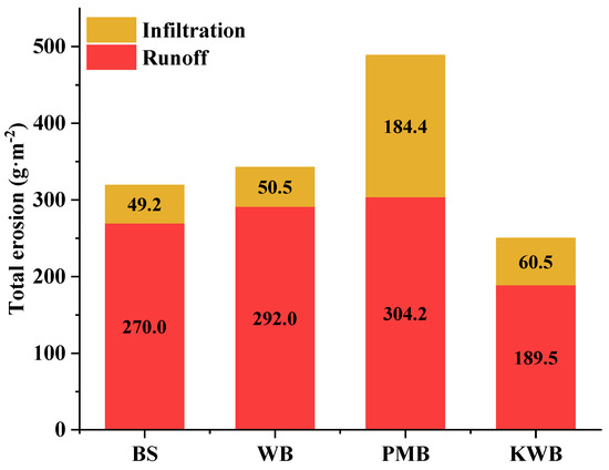 Equation (4) is used to calculate the total erosion of runoff and infiltration in the whole rainfall event. Figure 7 shows the total erosion of samples during rainfall events. As shown in Figure 7, KWB has the lowest runoff erosion and infiltration erosion under low rainfall intensity, which are 189.5 g·m−2 and 60.5 g·m−2, respectively. Compared with BS (270.0 g·m−2 and 49.2 g·m−2), KWB effectually reduces the runoff erosion by 29.8%. On the contrary, PMB increases runoff erosion and infiltration erosion by 12.7% and 274.8%, respectively. It is interesting that WB increases the runoff erosion of the sample but basically did not affect the infiltration erosion. It can be observed that KWB can significantly reduce the total erosion by 21.7%. On the contrary, both WB and PMB increase the total amount of erosion in the two rainfall events by 7.3% and 53.1%, respectively.