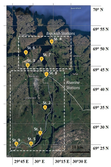 In the framework of the SpongePOP project, water surface samples (60–100 cm depth) were collected from 9 stations along the Pasvik River by using acid-washed polycarbonate containers during two sampling periods in 2014, representing the beginning (Ice-melt (−); 22–29 May) and the ongoing (Ice-melt (+); 17–24 July) phases of ice-melting [10,14]. Based on their location, the stations were divided into two groups, including riverine (Stations 9, 5, 1, 2, and 8) and brackish sampling sites (Stations 3, 7, 6, and 4) (Figure 1).