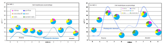 On the whole, remarkable small cocci represented, on average, about 60% (range: 32–71%) of total abundance, thus being the dominant morphotype at all stations and periods (Figure 2). In Ice-melt (−), they were followed by rods (19%), while vibrios, coccobacilli, and curved rods occurred in a small percentage (about 5% of the total cells). Finally, spirillae, observed only at brackish stations, were fairly negligible. Differently, in the Ice-melt (+) period, curved rods represented the second frequent morphotype (on average the 18% of the total) with a higher percentage at the brackish stations. Rods and vibrios accounted, on average, for 14 and 9%, respectively, and spirillae and coccobacilli were almost lacking.