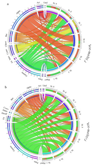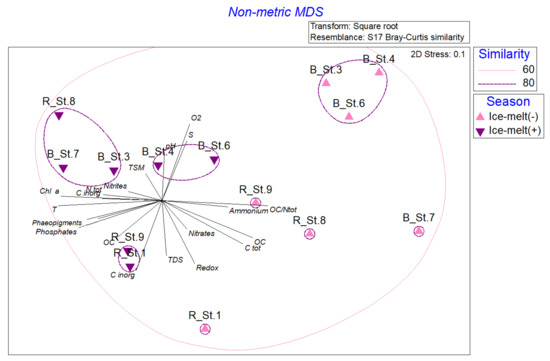 As shown in the nMDS in Figure 7, on which vectors from diversity data were superimposed, in Ice-melt (−),riverine St. 1 fully separated from all the other stations, grouping together in a unique cluster with a similarity of 80% (Figure 7a). The same analysis applied to data from Ice-melt (+) showed a complete separation of St. 5 (Figure 7b).