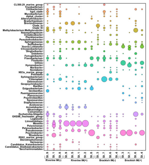 In particular, members of the genus Massilia were detected with an increased relative abundance at brackish St. 1, St. 2, and St. 5 in Ice-melt (+) (45.1, 59.6, and 43%, respectively). In the same period, among Gammaproteobacteria, the genus Psychrobacter was particularly abundant at St. 3, St. 4, and St. 7, accounting for 44.9, 35.9, and 49.8% of the total community, respectively. At St. 6, 30.4% of the bacterial community was represented by members of the genera Escherichia-Shigella (Figure 5).