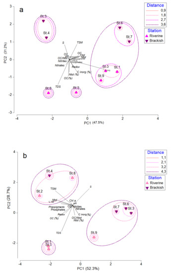 Figure 6b shows the PCA of samples collected in Ice-melt (+) conditions. The two main components explained 81% of the total variance, with the first component explaining 52.3% of the total variance, mainly influenced by salinity, and the second component accounting for 28.7% and influenced mainly by TSM and POC (positively correlated) and TDS (negatively correlated) values. Three different clusters occurred: One grouping riverine St. 1 and St. 5, and a second cluster including brackish St. 4 and riverine St. 2.