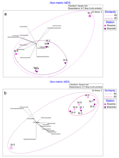 Figure 8, referring to abundance data at the phylum level in Ice-melt (−) and Ice-melt (+) conditions, showed a clear spatial separation of the samples taken during the two periods; while samples from the Ice-melt (+) period spread to a shorter distance than each other, samples from Ice-melt (−) appeared more dislocated and formed a single cluster including brackish St. 3, St. 4, and St. 6. Stations from the Ice-melt (+) season formed three small clusters with a similarity of 80%, organized as follows: Riverine St. 1 and St. 9; brackish St. 4 and St. 6; brackish St. 3, St. 7, and riverine St. 8. A significant difference was highlighted in relative abundance by the ANOSIM test computed by imposing “season” (Ice-melt (−) and Ice-melt (+)) as factors (Global R = 0.6; p = 0.001), and the SIMPER analysis attributes this difference mainly to Bacteroidetes and Actinobacteria abundances with cumulative values of 77.6% and 68.7%, respectively.