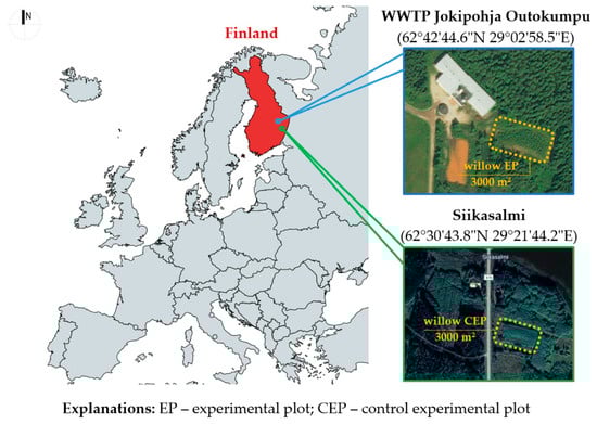 The location of wastewater treatment plant (WWTP) and willow experiment plot (EP) in Jokipohja Outokumpu and control experimental plot (CEP) in Siikasalmi.