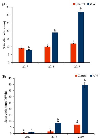 Willow diameter growth (A) and total dry biomass production (B) in three years once exposed to WW irrigation in the field (mean ± SE). Diameter (n = 30) and yield were analyzed using ANCOVA for treatment. Different small letters represent the significant difference between treatments at p < 0.05 using Tukey’s HSD test.