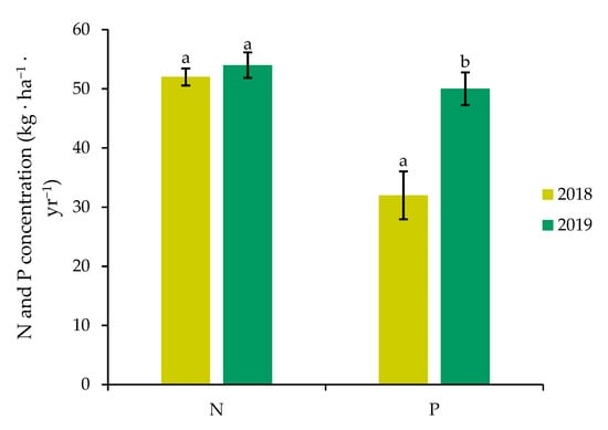 Figure 4 demonstrates that willow was able to accumulate the highest amount (54 kg·ha−1·year−1) of N in the second year (2019) as compared to the first year (2018). Nitrogen concentration was in the range 52–54 kg·ha−1·year−1 while no significant differences were noticed between the years, but a comparison shows that the concentration of N was marginally increased around 3% in the second year as compared to the first year. On the other hand, P concentration was also found highest in the second year (50 kg·ha−1·year−1) as compared to the first year (32 kg·ha−1·year−1). Remarkably, P concentration increased significantly by about 56% in the second year once compared with the first year, though a significant difference was observed between the years. Nevertheless, there was a marked increase noticed for total P concentration in the second year as compared to the first year.