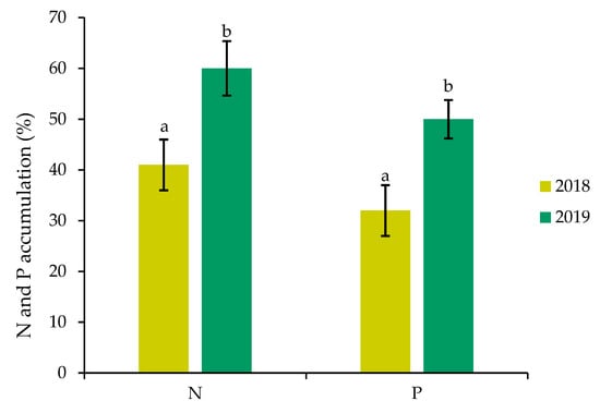 The highest N (60%) and P (50%) uptake were observed in the second year as compared to the first year. For example, in the second year, an increment of 46% and 56% was noticed for N and P, respectively, as compared to the first year (Figure 5). However, during two growing periods, nitrogen accumulation in willow was observed higher than P. Significant difference (p < 0.05) was seen between the years (2018 and 2019) for both N and P uptake.