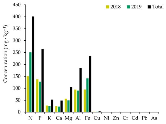 Soil analyses were carried out for only WW-treated soil in the Outokumpu study area. We analyzed nutrient (N, P, Mg, Ca, K, Fe, and Al) and heavy metals (Cu, Ni, Zn, Cr, Cd, Pb, and As) concentrations in WW-treated soil at the end of the growing season in 2018 and 2019. Results demonstrated that WW-treated soil contained large concentrations of N (401 mg·kg–1) and P (265 mg·kg–1) including other nutrients, though very low heavy metals concentration (0.002–3.04 mg·kg–1) was detected in soils for Cu, Ni, Zn, Cr, Cd, Pb, and As. Overall, the pattern of total nutrient concentration in soil were observed as N > P > Fe > Al > Mg > Ca (Figure 6). Moreover, WW has nutritious properties since it might be used to irrigate crops to reduce the dependence on freshwater usage.