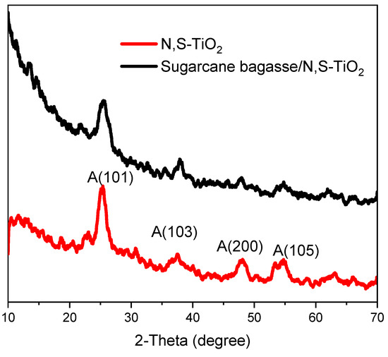 In Figure 1, XRD analysis was performed to characterize the nitrogen and sulfur co-doped TiO2 and sugarcane bagasse/N,S-TiO2 composite. Since RSB/N,S-TiO2, ASB/N,S-TiO2, and CSB/N,S-TiO2 have the same XRD spectrum, a general plot called sugarcane bagasse/N,S-TiO2 is shown. The peaks at the 2-Theta angles correspond to the (101), (103), (200), and (105) diffraction planes of the anatase phase [30]. The pre-treatments of the sugarcane bagasse did not change the crystal structure of the photocatalyst. With a 100% anatase structure, the composite material exhibits a better photocatalytic degradation than the rutile or brookite phase [31].