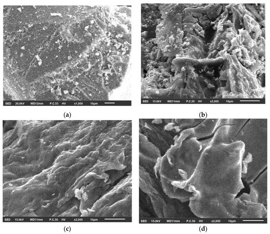 SEM images of N,S-TiO2, RSB/N,S-TiO2, ASB/N,S-TiO2, and CSB/N,S-TiO2 are shown in Figure 2. N,S-TiO2 nanoparticles have a uniform, even, smooth surface and a spherical shape. Composite materials have a different surface morphology; specifically, RSB/N,S-TiO2 has a rough and uneven surface compared to ASB/N,S-TiO2 and CSB/N,S-TiO2; ASB/N,S-TiO2 seems to be more abrasive than RSB/N,S-TiO2; therefore, it is smoother and more uniform. CSB/N,S-TiO2 is in the form of the corroded plates. ASB/N,S-TiO2 material has a smoother surface; therefore, the N,S-TiO2 nanoparticles can be easily exposed to light to generate the reactive oxygen species that are necessary for antibiotic degradation reaction. In contrast, RSB/N,S-TiO2 and CSB/N,S-TiO2 have catalyst particles located deep inside, making it difficult for N,S-TiO2 particles to be exposed to light.