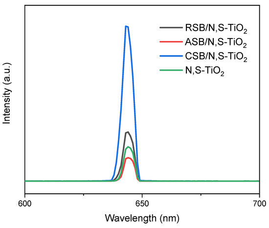Photoluminescence spectra were used to investigate the recombination of electron–hole pairs in the composite materials compared to N,S-TiO2. This is shown Figure 4. It can be seen that the photoluminescence intensity of CSB/N,S-TiO2 is the highest compared to other materials and decreases steadily in RSB/N,S-TiO2; N,S-TiO2; and ASB/N,S-TiO2. ASB/N,S-TiO2 can be predicted to have better photocatalytic activity since the recombination of the e-/h pairs is minimal. After calcination at 450 °C, sugarcane bagasse naturally converted into biochar, which can trap electrons at conduction band energy. The alkaline pre-treated sugarcane bagasse may strengthen the activated state of the photocatalyst since the vacant d orbitals of metals present in biochar act as electron acceptors that prevent the recombination of the e−/h pairs; therefore, the production of OH•, H2O2, and O2•− when in contact with O2 on the surface of the material [36] causes an improvement in the photocatalytic degradation. The results also suggest that the pretreatment methods of support material influence the photocatalytic material properties.