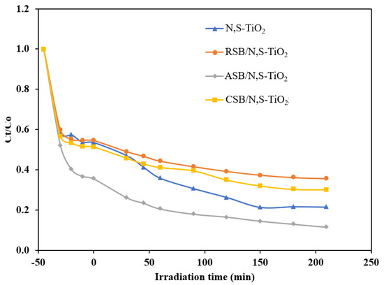 Figure 5 shows the adsorption reaction and photocatalytic degradation of CIP of nitrogen, sulfur co-doped TiO2, and three composite materials. It was observed that about 46–49% CIP in solution absorbed on N,S-TiO2; RSB/N,S-TiO2; and CSB/N,S-TiO2 after 45 min in the dark, while the amount of CIP removed by ASB/N,S-TiO2 was approximately 66%. This suggests that N,S-TiO2 incorporation with alkaline pre-treated sugarcane bagasse improved the antibiotic adsorption capacity. CIP concentrations tended to decrease sharply during about 60 min of illumination; after that, they gradually decreased in all four materials. The alkaline pretreated sugarcane bagasse gave the highest antibiotic treatment efficiency compared to the non-pretreated and acid–base pretreatment samples. ASB/N,S-TiO2 was chosen for the effect of the experimental parameters since the removal efficiency of ASB/N,S-TiO2 is higher than RSB/N,S-TiO2 and CSB/N,S-TiO2 in comparison with N,S-TiO2.