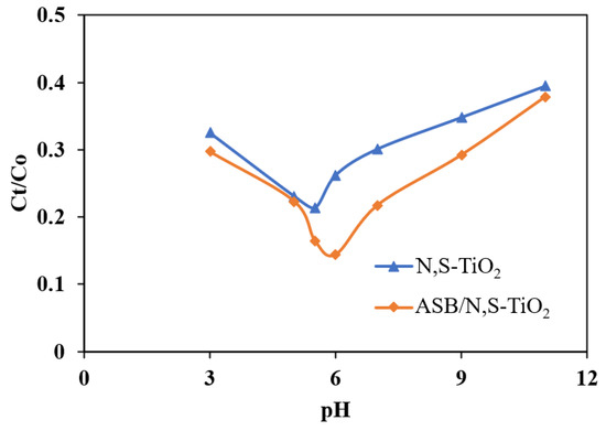 The influence of pH in the range 3–11 was studied by performing experiments on the removal of CIP in this pH range; the results are shown in Figure 6. The trend of the CIP concentration as a function of pH was similar for both materials, decreasing more in acidic solutions than in basic solutions. The highest treatment efficiency was observed at a pH in the range of 5.5 to 6 for N,S-TiO2 (78.68%) and ASB/N,S-TiO2 (85.59%). This can be explained by two effects: (i) the surface of sugarcane bagasse after calcination usually carries a negative charge surface when the pH is below 7, which gives CIP a positive charge (the presence of N+) leading to a higher CIP adsorption capacity than in the alkaline environment; (ii) the photocatalytic reaction is also enhanced in acidic solutions due to the increase of reactive oxygen species, specifically the OH• radicals. This result also agrees with the study of Alireza et al. [11]. Therefore, the pH = 5.5–6 of the CIP solution was applied for further experiments.