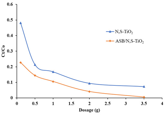 Effect of dosage on removal for N,S-TiO2 and ASB/N,S-TiO2 composites (condition: contact time = 150 min irradiation, [CIP]0 = 30 ppm, pH = 5.5–6).