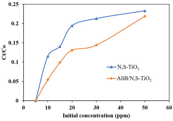 Effect of initial concentration on removal for N,S-TiO2 and ASB/N,S-TiO2 composites (condition: contact time = 150 min irradiation, pH = 5.5–6, dosage = 0.05 mg).