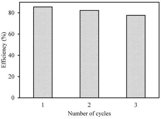 To assess the long-term performance of the ASB/N,S-TiO2 composite photocatalyst, three consecutive runs were conducted under the same reaction conditions, as shown in Figure 9. The change in the removal efficiency of ASB/N,S-TiO2 in the presence of 30 ppm CIP antibiotic was found to be minimal, with only ∼10% (reduced from 85.59% to 77.67%) of treatment activity lost after the third run. The results revealed that the composite photocatalytic activity of ASB/N,S-TiO2 remained relatively stable. This suggests its suitability for water treatment applications.