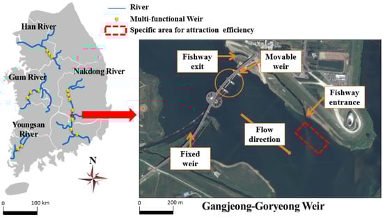 Riverine characteristics undergo drastic changes due to increasing number of multifunctional dams and weirs built for the purpose of managing water resources more efficiently. In particular, hydraulic structures can cause serious changes to the ecosystems around them [1,2,3,4,5]. In South Korea, 16 large-scale multi-functional weirs have been built as part of the Four Major Rivers Restoration Project. Such structures built across a river can cause diverse problems, including migration and population changes of fish species dwelling in the river, genetic fragmentation, and habitat condition alterations [6]. Such changes especially have adverse effects on local fishes migrating upstream or downstream during their spawning periods. Fishways are installed in the river-crossing structures to solve this problem.