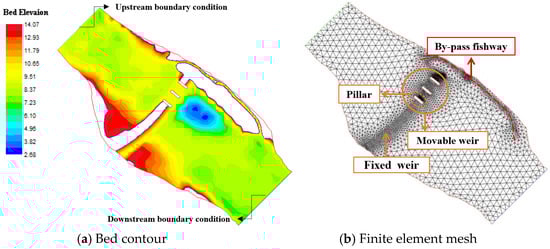 The in situ observational data obtained in 2013 were used to constitute the flow rate conditions for simulation to allow attraction efficiency analysis. Specifically, the flow rate and water level of the Gangjeong-Goryeong Weir were monitored on an hourly basis in 2013 and used for calculating the mode of each month which served as the representative value for that month. The boundary conditions (flow rate at the upstream and water level of the downstream section) of each month used for the simulation are outlined in Table 1. The reason that the downstream boundary condition is the same at 14.1 m is because the water gate of the entire multi-function weir of the Nakdong River is adjusted to keep the management water level constant. For the parameters of the River2D module, a roughness coefficient of 0.023 was used based on the study of [9]. According to the values in the table, the upstream and downstream sections of the Gangjeong-Goryeong Weir and the by-pass fishway were set as domains for River2D application. Topography files comprising nodes and elements were created using topographic and numerical maps of the surrounding areas. FE mesh consisting of 2897 nodes and 5526 elements was set up in the River2D_Bed module from these topography files. The topographic data and FE mesh of the study site of the Gangjeong-Goryeong Weir are shown in Figure 2.