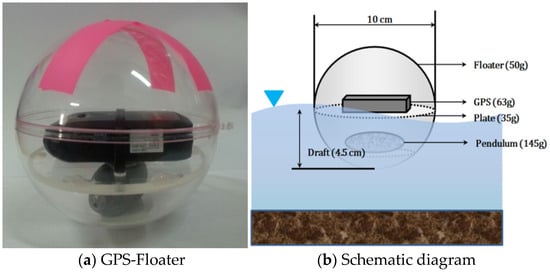 In this study, the velocity field in the area around the by-pass fishway entrance was estimated using GPS drifter tracking instead of velocity meter for precise measurement because it was difficult to access the fishway entrance area (shown in Figure 1). Moreover, it was necessary to find out the extent of the section to which fish were attracted by the attraction flow with slower stream current compared to the velocity within the fishway. The Eulerian type measurement method using ADCP or ADV has limitations. The buoyancy method that measures the flow velocity using a GPS drifter is capable of long-term measurement of the Lagrangian type. In studies of Lagrangian type measurement using GPS drifter, there were measurement and analysis studies on the transport and diffusion of pollutants [15,16,17,18,19]. This required a Lagrangian view which was implemented by studying the dispersion of the GPS drifters injected from the upstream point of the fishway entrance. The GPS drifter was designed and manufactured taking account of draft, convenience, portability, and streamline as shown in Figure 3.