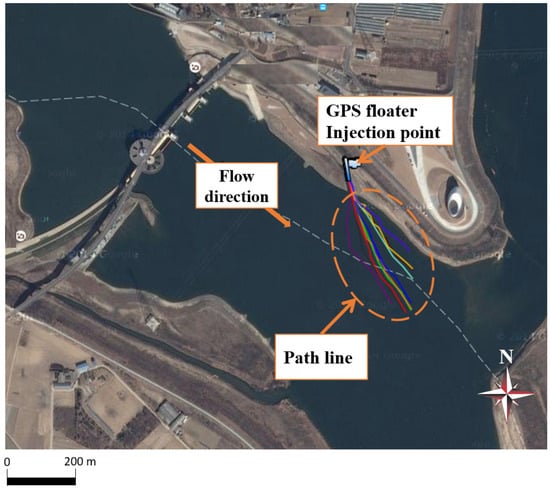The simulated velocity field was validated by comparing the in situ observational results using the GPS drifters to the River2D output. The in situ experiment with GPS drifters was conducted in September. At that time, the water level was low due to low precipitation. Therefore, the movable weir of the Gangjeong-Goryeong Weir was closed and water was discharged only to the by-pass fishway. A graphic representation of the path lines of the GPS drifters descending from the upstream point of the fishway entrance is shown in Figure 5.